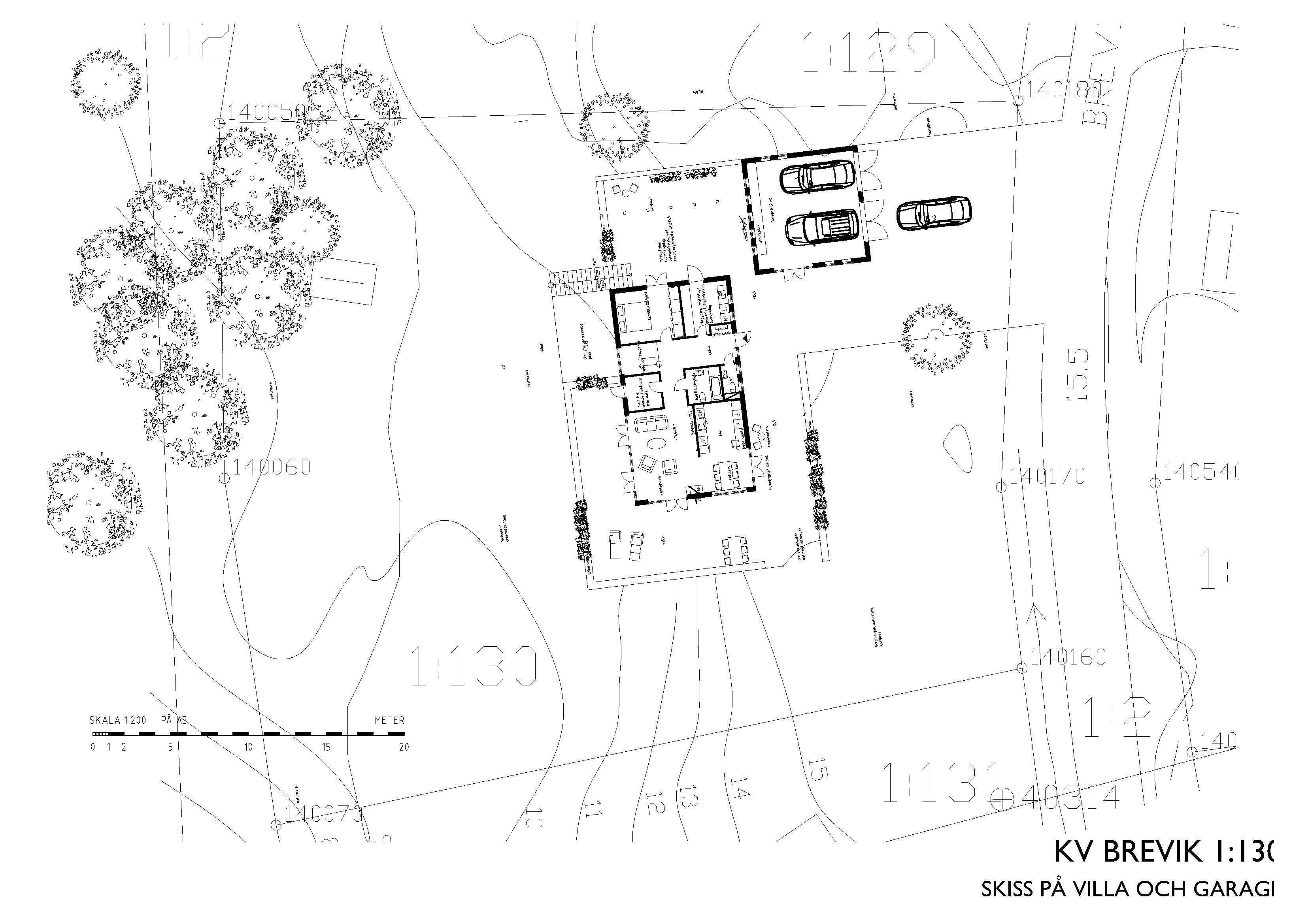 Utmaningen var att rita en villa och ett garage som på ett naturligt sätt drog nytta av tomten. Uppdragsgivarna ville inte spränga. Svaret blev att ställa huvudbyggnaden så att halva källarplanet helt naturligt fick full ståhöjd och hamnade i souterrain. Souterrainplanet får ökad volym genom att gå under en terrass. Mot norr en sluten kvadratisk gård, som en klostergård som ansluter till sovrum och tvättstuga.